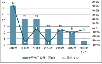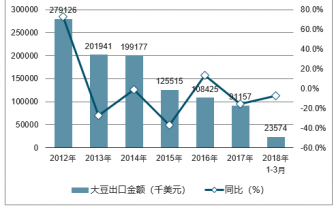 2019年1-3月中國大豆出口數(shù)量為3萬噸,同比下降4.7%;2019年1-3月中國大豆出口金額為23574千美元,同比下降7.4%。