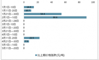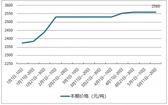 截止至2019年5月中旬,復合肥價格為2560/噸;復合肥市場價格在4月下旬至5月中旬達到最高值。1月上旬,復合肥價格呈現(xiàn)最低值,為2374.3元/噸,環(huán)比2019年12月下旬上漲14.3元/噸,漲幅為0.6%。最高值與最低值相差185.7元/噸。