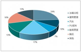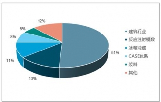 我國MDI主要應用于冰箱冷藏、建筑、漿料和鞋底原液等方面,其中聚合MDI大部分用于冰箱冷柜和建筑、汽車;純MDI大部分用于PU漿料、鞋底原液和氨綸。
