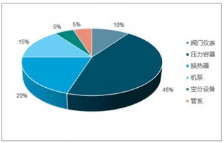 根據數據統計,其中設備投資中,壓力容器約占總需求的45%,換熱器約占20%,機泵約占15%,空分設備、管系、閥門、儀表及電控等占20%。