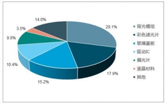 液晶行業產業鏈較長,上游為基礎化工原料以及材料器件,中游為液晶面板,下游為各類電子產品。其中上游主要包括液晶材料(中間體、單體、混晶)、偏光片、驅動IC、玻璃基板、濾光片、背光模組等,成本占比分別為3.5%、9.9%、10.4%、15.2%、17.9%、29.1%。
