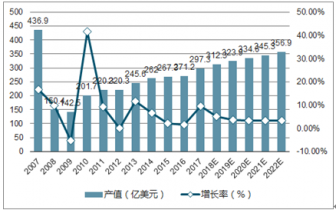 2007-2022年全球PCB產(chǎn)值及增長率變化情況