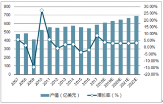2007-2022年全球PCB產(chǎn)值及增長率變化情況