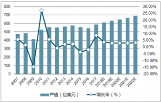 2007-2022年全球PCB產(chǎn)值及增長(zhǎng)率變化情況