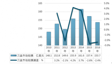 2005-2016年國際刀具市場規(guī)模及增速。 |