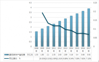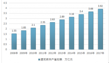 據(jù)統(tǒng)計2016年我國建筑裝飾行業(yè)總產(chǎn)值達到3.66萬億元,其中家裝行業(yè)產(chǎn)值為1.78萬億元,公裝行業(yè)產(chǎn)值為1.88萬億元。2019年國內(nèi)建筑裝飾行業(yè)總產(chǎn)值預(yù)計將達到了3.92萬億元。