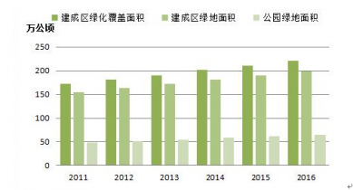 2016年年末,城市建成區(qū)綠化覆蓋面積220.4萬公頃,比上年增長(zhǎng)4.7%,建成區(qū)綠化覆蓋率40.30%,比上年增加0.18個(gè)百分點(diǎn);建成區(qū)綠地面積199.3萬公頃,比上年增長(zhǎng)4.4%,建成區(qū)綠地率36.43%,比上年增加0.07個(gè)百分點(diǎn);公園綠地面積65.4萬公頃,比上年增長(zhǎng)6.4%,人均公園綠地面積13.70平方米,比上年增加0.35平方米。