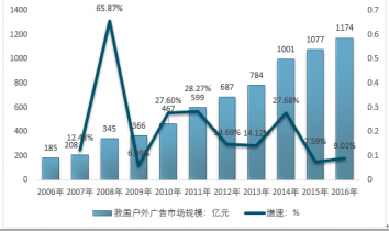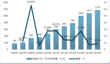 2006-2016年我國戶外廣告市場規(guī)模及增速走勢圖 |