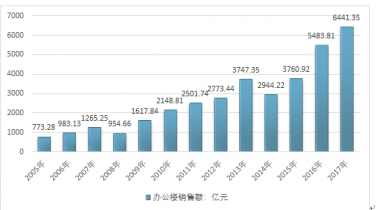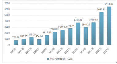 2016年我國(guó)辦公樓銷售收入為5483.81億元,2017年我國(guó)辦公樓銷售收入為6441.35億元,銷售收入較上年同期增長(zhǎng)17.46%。