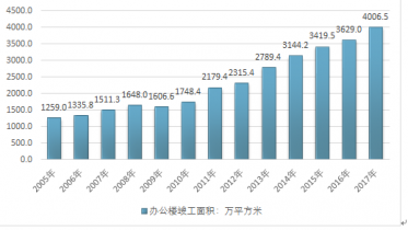 2016年我國(guó)辦公樓竣工面積為3629.0萬(wàn)平方米,2017年我國(guó)辦公樓竣工面積增長(zhǎng)至4006.5萬(wàn)平方米。