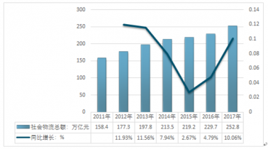 2011-2017年中國社會(huì)物流總額增長情況 |