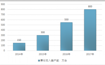 近幾年,我國(guó)霧化吸入器行業(yè)產(chǎn)能不斷擴(kuò)大。從2014年的150萬(wàn)臺(tái)增長(zhǎng)到2017年的800萬(wàn)臺(tái)。