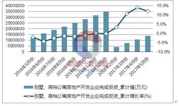 數(shù)據(jù)顯示:2017年1-5月份中國別墅、高檔公寓房地產(chǎn)開發(fā)企業(yè)投資完成13927149.00萬元,同比增長12.10%;2016年1-12月份中國別墅、高檔公寓房地產(chǎn)開發(fā)企業(yè)投資完成34787431.00萬元,同比下降0.10%。