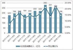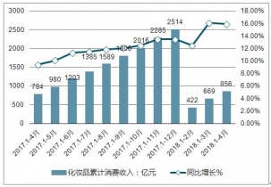 2019年4月份化妝品消費(fèi)收入196億元,與去年同期增長(zhǎng)15.1%。2019年1-4月中國(guó)化妝品累計(jì)消費(fèi)收入達(dá)856億元,同比增加15.9%