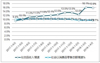 2019年1-4月中國化妝品收入同比增加15.9%,高于同期社會消費(fèi)品零售總額增速6.2個(gè)百分點(diǎn)。