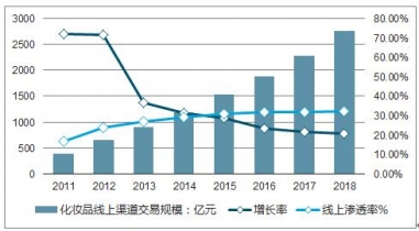 2011-2019年中國化妝品線上渠道交易規模及滲透率走勢