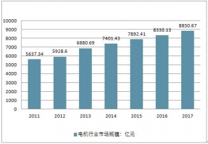 2017年我國(guó)電機(jī)行業(yè)市場(chǎng)規(guī)模約8850.67億元,同比2016年的8330.13億元增長(zhǎng)了6.25%,
