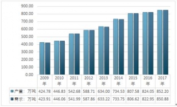近年來,中國紅棗產(chǎn)品市場總體保持良好的增長勢頭。2009 年全國棗產(chǎn)量424.78萬噸,2017年棗產(chǎn)量達到852.20萬噸。2009 年全國紅棗消費量423.91萬噸,2017年紅棗消費量達到850.88萬噸。