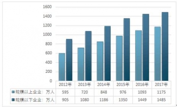 2012-2017年我國家政服務(wù)業(yè)不同規(guī)模企業(yè)從業(yè)人數(shù)統(tǒng)計圖