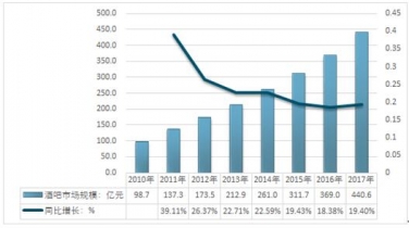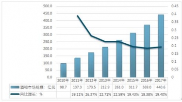 2010-2017年中國(guó)酒吧行業(yè)市場(chǎng)規(guī)模及增速情況