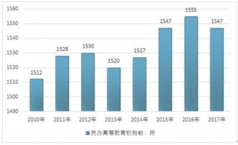 2016年我國民辦高等教育學校(機構)數量為1555所,2017年我國民辦高等教育學校(機構)數量為1547所,機構數較上年同期減少8所。