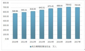 2016年我國民辦高等教育學校(機構)在校生總數為709.62萬人,2017年民辦高等教育學校(機構)在校生總數為703.05萬人,在校生總數同比減少6.57萬人。