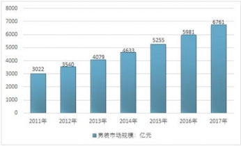 2017年男裝市場的零售規(guī)模達(dá)到了6761億元;2020年,男裝市場的零售規(guī)模預(yù)計(jì)將達(dá)到9793億元。