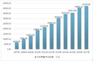 根據(jù)國家統(tǒng)計(jì)局?jǐn)?shù)據(jù),2017年我國汽車零售市場規(guī)模約42222億元,同比2016年的40692.16億元增長了3.76%,近幾年我國汽車零售市場規(guī)模情況如下圖所示: