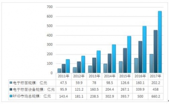 2017年中國射頻識別(RFID)市場規(guī)模超660.2億元,同比增長32.04%。近幾年我國RFID產(chǎn)業(yè)規(guī)模情況如下圖所示: