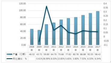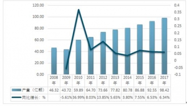 2008-2017年我國MCU芯片產(chǎn)量及增速走勢圖