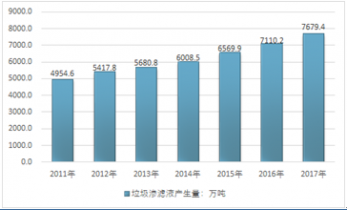 2011-2017年我國垃圾焚燒廠滲濾液產(chǎn)量情況 |