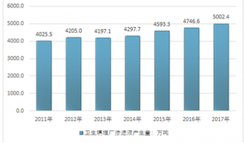 2016年我國衛(wèi)生填埋場滲濾液產(chǎn)生量為4746.6萬噸,2017年我國衛(wèi)生填埋場滲濾液產(chǎn)生量增長至5002.4萬噸。