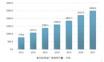 2016年我國垃圾焚燒廠滲濾液產(chǎn)量2213.5萬噸,2017年上升至2496.6萬噸。