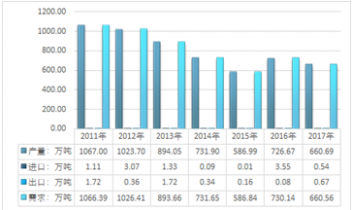2011-2017年我國硅錳合金供需平衡走勢圖 |