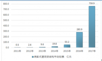 據(jù)統(tǒng)計2015年我國裝配式建筑鋼結(jié)構(gòu)市場規(guī)模為53.2億元,2016年我國裝配式建筑鋼結(jié)構(gòu)市場規(guī)模增長至283.9億元,隨著裝配式建筑領(lǐng)域鋼結(jié)構(gòu)項(xiàng)目的增長,2017年我國裝配式建筑鋼結(jié)構(gòu)市場規(guī)模達(dá)到759.9億元。