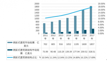 根據(jù)測算,2017年全球裝配式建筑市場規(guī)模為1857億美元,裝配式建筑鋼結(jié)構(gòu)市場規(guī)模為328.51億美元,裝配式建筑鋼結(jié)構(gòu)市場占比達(dá)17.69%。