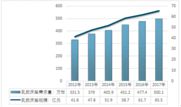 2012-2017年我國乳膠床墊需求總量及市場規(guī)模走勢圖 |
