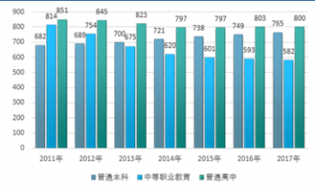 2011-2017年普通本專科、中等職業(yè)教育及普通高中招生人數(shù)(萬人) |