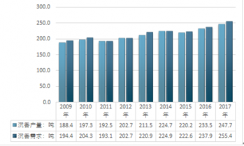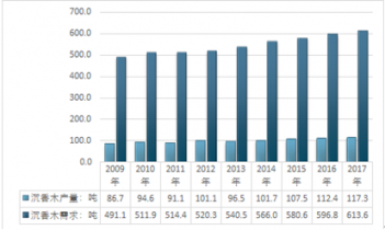 目前國內種植可用于結香的沉香樹超1000萬株,人工結香沉香樹數約30萬株,2017我國沉香產量約為247.7噸(絕大部分為人工結香),國內需求總量約為255.4噸。2017我國沉香木產量為117.3噸,國內沉香木需求總量約為613.6噸。