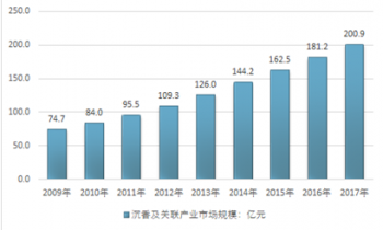 2016年我國沉香及關聯產業市場規模為181.2億元,2017年我國沉香及關聯產業規模增長至200.9億元。其中沉香(人工結香)市場規模為4.02億元,沉香木市場規模為3.11億元。