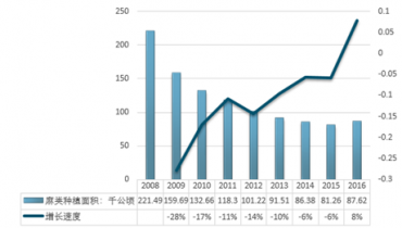 自2008年以后,我國麻類作物種植面積不斷走低,直到2016年才有回升,2008年我國麻類作物種植面積為221.49千公頃,2015年種植面積僅為81.26千公頃,2016年小幅回升至87.62千公頃。