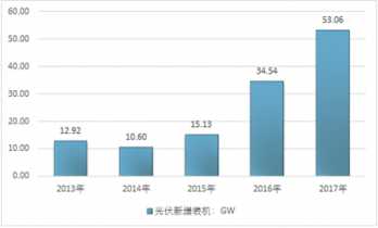 2017年,中國光伏發(fā)電新增裝機為53.06GW,同比增加18.52GW,增速高達53.62%,再次刷新歷史高位。此外,2017年的新增裝機還是2016年的1.5倍、2015年的3.5倍、2014年的5陪和2013年的4倍,由此可見2017年光伏新增裝機出現(xiàn)了大幅快速增長。