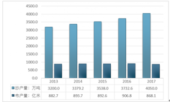 圖表 2013-2017年中國紗、布產(chǎn)量走勢(shì)圖
