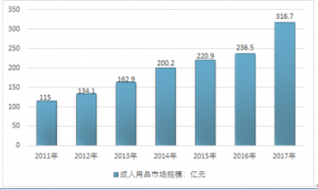 我國(guó)成人用品市場(chǎng)發(fā)展迅猛,近年來(lái)保持高增長(zhǎng)的市場(chǎng)態(tài)勢(shì),2017年中國(guó)成人用品市場(chǎng)規(guī)模達(dá)316.7億元。隨著性觀念的不斷改變,未來(lái)幾年中國(guó)成人用品市場(chǎng)將持續(xù)擴(kuò)大。