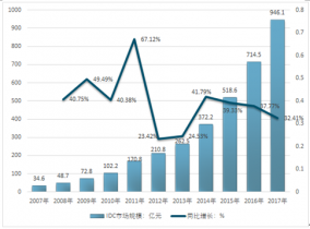 2017年中國IDC市場總規模為946.1億元,同比增長率32.4%,增長率放緩5.4個百分點。IDC市場規模的絕對值仍然保持增長,我國IDC市場正在從高速發展期過渡向成熟期,客戶需求更加明確清晰,在采購IDC業務時能夠準確評估實際需求;同時,IDC服務商也保持均速擴張原則,穩步開拓市場。市場供給雙方均理性處理采購需求與供給能力,這標志著中國IDC正發展為專業、合規、良性的市場。