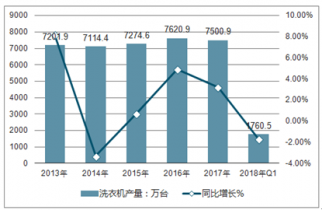 近六年來我國洗衣機產(chǎn)量都保持在7000萬臺以上, 2015-2018年冰箱產(chǎn)量年均復(fù)合增長率為1.02%。數(shù)據(jù)顯示, 2017全年中國家用洗衣機產(chǎn)量達(dá)到7500.9萬臺,累計增長3.2%。