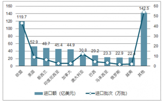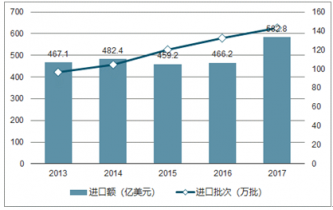 2011年,中國進口食品貿易額為374.5億美元;2017年,中國進口食品貿易額達到459.2億美元。5年間,進口食品貿易額年均增長率達5.2%。2017年中國進口食品貿易額將達到449億美元,未來五年(2017-2021)年均復合增長率約為3.22%,2021年中國進口食品貿易額將達到510億美元。