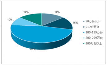目前我國廢棄電器電子產(chǎn)品處理企業(yè)的處理量主要集中在100-199萬臺(tái)區(qū)間內(nèi),其占比接近50%。50萬臺(tái)以下、51-99萬臺(tái)以及300萬臺(tái)以上處理能力的企業(yè)分布相似。200-299萬臺(tái)處理能力的企業(yè)占比較低,僅為10%。