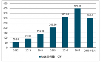 2017年我國快遞業(yè)務(wù)量完成400.56億件,快遞業(yè)務(wù)量同比增長28. 04%;2017年我國快遞業(yè)務(wù)收入完成4957.11億元,同比增長24. 7.3%。2018年1-8月我國快遞業(yè)務(wù)量為302.60億件,快遞業(yè)務(wù)收入增長至3715.23億元。作為世界第.一快遞大國,我國快遞業(yè)實(shí)現(xiàn)了從“量”的提升到“質(zhì)”的飛躍。《國務(wù)院關(guān)于促進(jìn)快遞業(yè)發(fā)展的若干意見》認(rèn)為到2020 年快遞業(yè)年業(yè)務(wù)收入達(dá)八千億元,業(yè)務(wù)量達(dá)到五百億件,可見快遞行業(yè)的大體量已經(jīng)如此深入介入與改變了人們的生活。