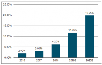 圖表:2015-2019年全球智能鎖行業(yè)市場規(guī)模及增速